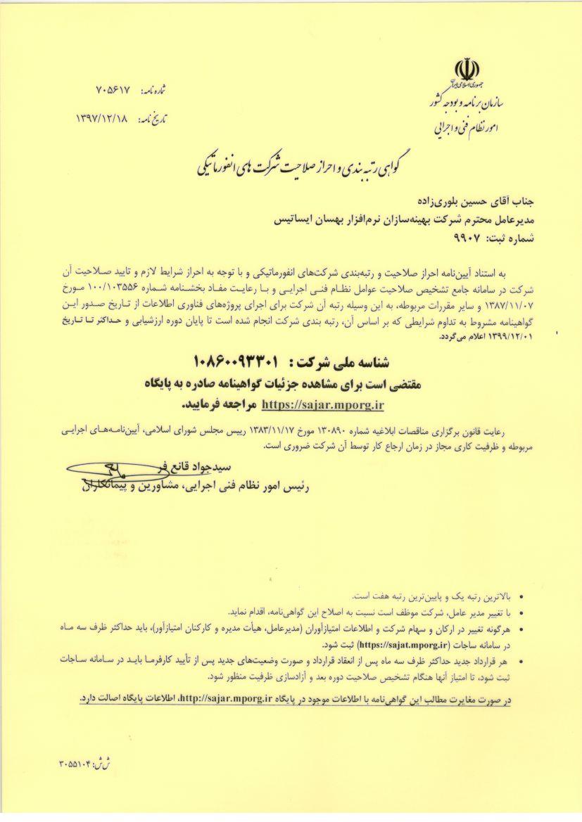 گواهی رتبه بندی و احراز صلاحیت شرکت های انفورماتیکی